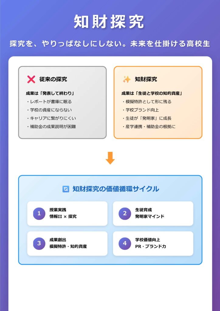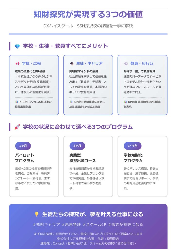 <DXハイスクール/SSH採択校の高校生向け「知財探究」サービス(※弊社ビジネスモデル(特許出願中)を利用)紹介>